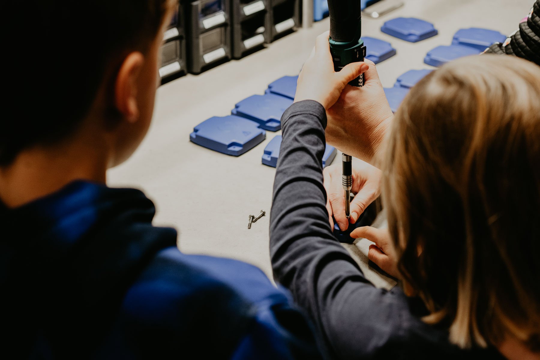Auch in der Montage gab es Action: Unter Anleitung unserer Montageprofis durften die Kinder Schrauben in die Deckel unserer RN 4 Sensoren drehen – mit echter Werkstatt-Atmosphäre.