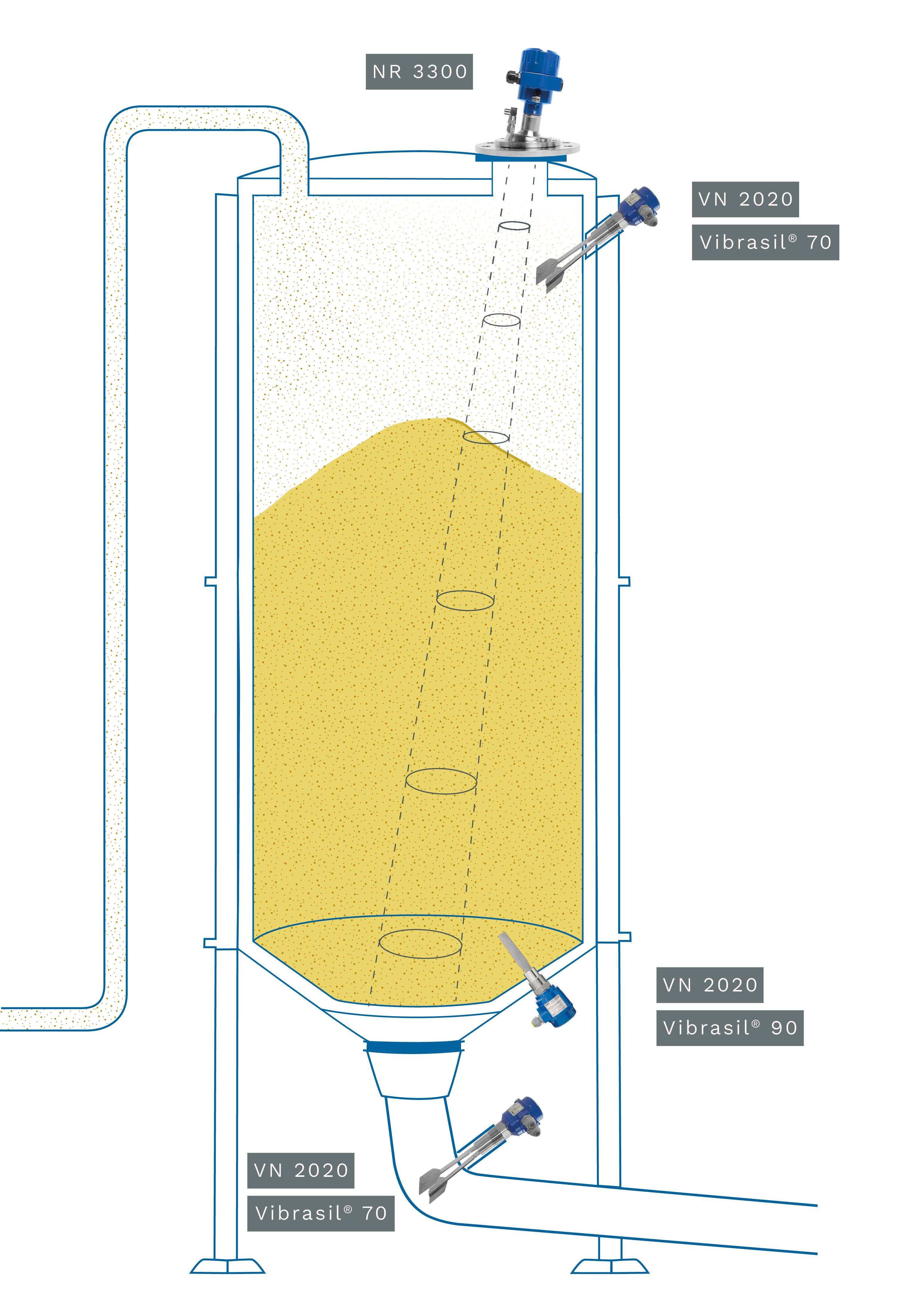 In the discharge branch, another VN 2020 with Vibrasil® 70 reliably detects flow status – for example, when using discharge aids such as pneumatic conveying or vibration – protecting the process from downtime.